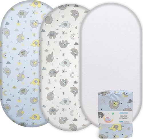 Acrali Home Moses Basket Sheets 35x75 cm – 3 Pack 100% Pure Cotton Ultra Soft, Breathable & Gentle on Baby Skin – 1 Waterproof Moses Basket Mattress Protector & 2 Pram Fitted Sheets – Elephant Design