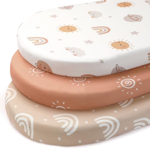 FIEMOL Baby Moses Basket Sheets, 81x41 cm Pram Sheets Fitted Universal Fit for Bassinet Cradle Oval Rectangle Round Mattress, 3 Pack Ultra Soft & Silky Smooth Microfiber Orange Sun Rainbow