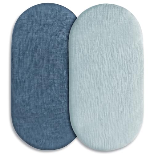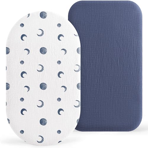 Susurration Moses Basket Sheets, 2 Pack Muslin Cotton Bassinet Sheets Fits Oval and Rectangle Crib Bassinet Mattress, Breathable and Skin-Friendly for Baby Boy and Girl, 90x50 cm (BlueMoon&Royal Blue)