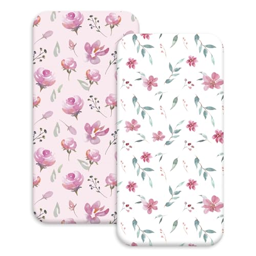 Soarwg Kids Moses Basket Sheets, Cozy and Lightweight Oeko-tex100 Baby Bassinet Sheets for Boy and Girl, Crib Fitted Sheets Fit for Oval, Hourglass & Rectangle Bassinet 2Pack Flowers