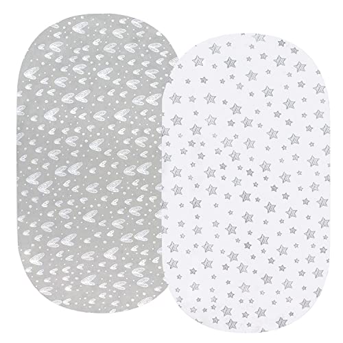 Moses Basket Sheets Fitted,100% Jersey Knit Cotton Bassinet Sheets(70x32cm) 2 Pack, Breathable and Heavenly Soft, Grey Hearts and White Stars Print for Baby