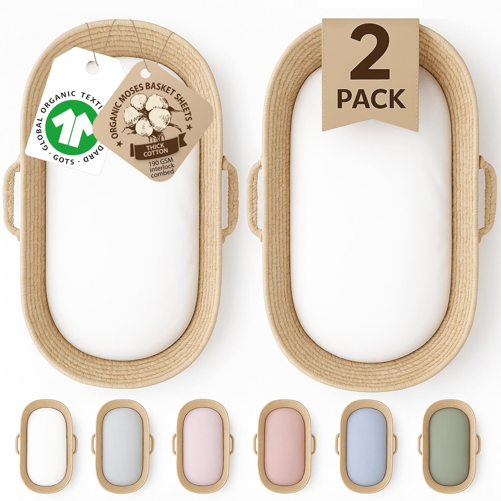GOTS Organic 2 x Moses Basket Fitted Sheets - Luxuriously Tick 190GSM Organic Cotton - Softest Combed Cotton - Compatible With Clair de lune Moses Basket & Pram, Stroller Matress Cover Sheet