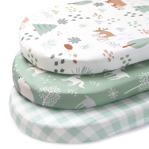 FIEMOL Baby Moses Basket Sheets, 81x41 cm Pram Sheets Fitted Universal Fit for Bassinet Cradle Oval Rectangle Round Mattress, 3 Pack Ultra Soft & Silky Smooth Microfiber Green Forest Bear