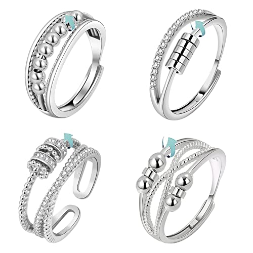 Hifot 4Pcs Anxiety Rings for Women, Silver Fidget Ring for Anxiety Women Open Spinner Rings for Teenage girls, Stress Relief Adjustable Ring for Mother Daughter Son Men Birthday Party Gifts