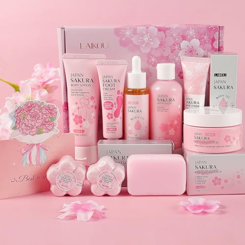 LAIKOU Sakura Bath Gift Set, Pamper Gifts for Women, Body Lotion Body Wash Scrub Hand Cream and More, Unique Self Care Package, Mothers Day Christmas Birthday Gift Ideas for Her Friend Sister Mum Wife
