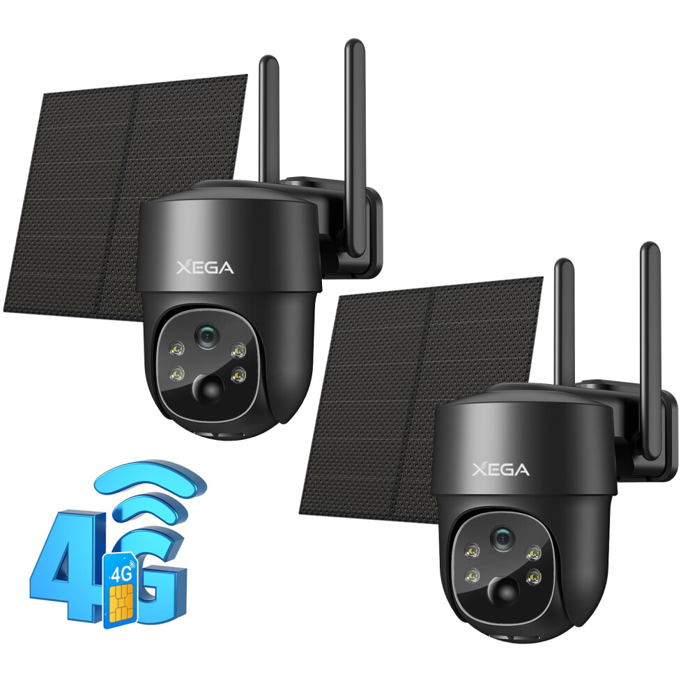 Xega 2 Pack 4G LTE Cellular Security Camera Solar With SIM Card, Outdoor Wireless No WiFi Security Cam CCTV,2K HD PTZ Night Vision Motion Sensor Noti