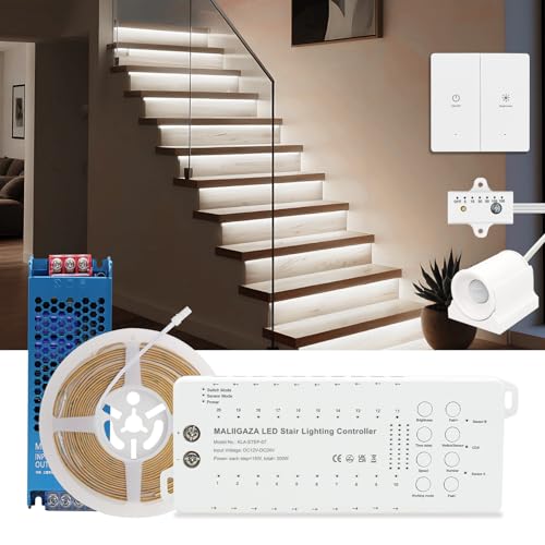 MALIIGAZA Intelligent 20-Step Motion Sensor Stair Light for Indoor, Multiple Working Mode Step Lights, 1m Cuttable COB LED Stair Lights Indoor with Pannel Switch (Cool White 6000K, 20-Step Kit)