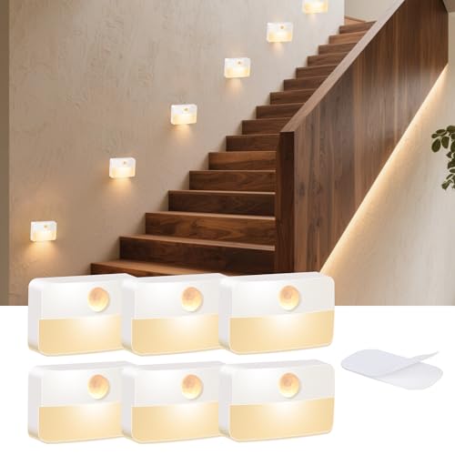 DJBoomy Motion Sensor Night Light for Indoor: 6 Pack Battery Operated Stair Lights LED 3000k Step Lights - Motion Sensor Lamp for Cabinet Closet Hallway Bedroom Stairs (Battery Powered)