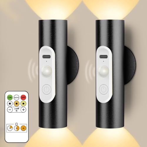 Magnetic Stick on Wall Lights Battery Operated, Wireless Wall Sconces Set of 2, Motion Sensor Night Light Indoor, USB Rechargeable Cordless with Remote Control, 3 Modes Dimmable, Black Aluminum