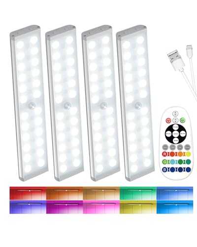 Kasanfe 58-LED Under Cabinet Kitchen Lights Wireless, RGB Motion Sensor Lights Indoor Rechargeable, LED Wardrobe Lights Remote Under Counter Lighting for Kitchen Shelf Pantry Desk (4 Packs)