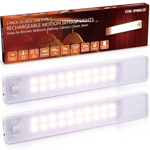 STAR-SPANGLED 8 inch Rechargeable Motion Sensor Lights Indoor, USB Stick on LED Magnetic Light Battery Powered for Stairs, Cupboard, Wardrobe, Closet, Cabinet, Kitchen, Hallway (Warm White, 2 Pack)