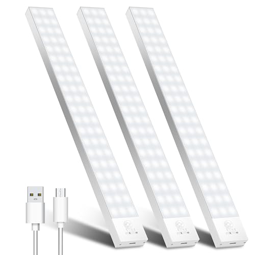 Lychico Motion Sensor Lights Indoor (30cm), 3 Pack 60 LED Under Cabinet Lights 6000K, USB Rechargeable Battery Powered Night Lights with Magnetic Strip for Kitchen, Wardrobe, Garage, Stairs, Bedroom