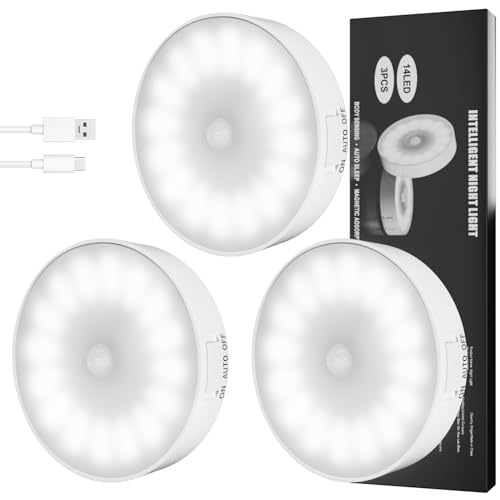 Electight 14 LEDs Motion Sensor Lights Indoor, 3 Pack Cordless Night Light Stick on Wall with Magnetic Base, USB Rechargeable Battery, Stair Lights, for Wardrobe,Cabinet,Stairs,Closet,Hallway