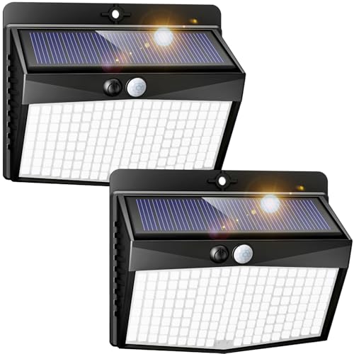 nipify Solar Lights Outdoor Garden Motion Sensor, 2 Pack 3 Modes 318LED Solar Powered Security Fence Light Waterproof, Bright Pir Wall Light for Yard Garage Outside Door Porch Warm White