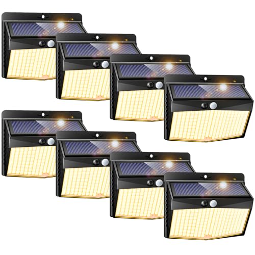 Peasur Solar Security Lights Outdoor Motion Sensor, 168LED 8 Pack Solar Powered Fence Light with 3 Modes, IP65 Waterproof Solar Wall Lighting for Garden Outside-Warm White