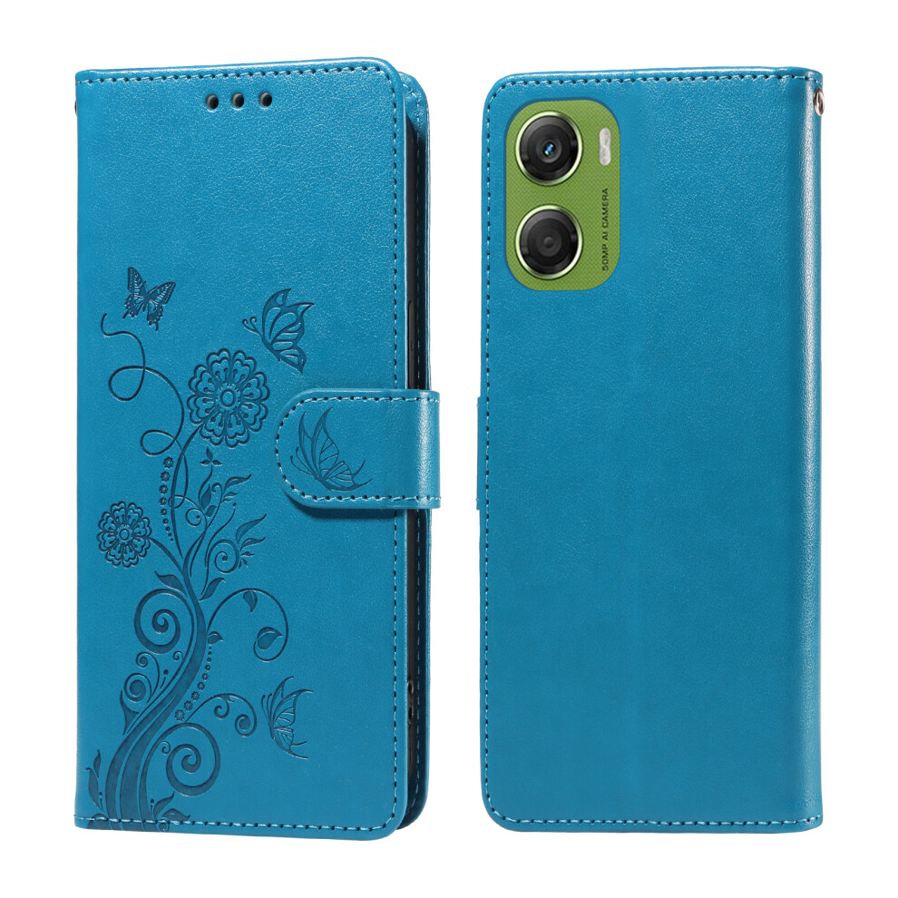 (Blue) For Motorola Moto G06 4G Leather Case Butterfly Floral Imprint Wallet Stand Cover - Golden