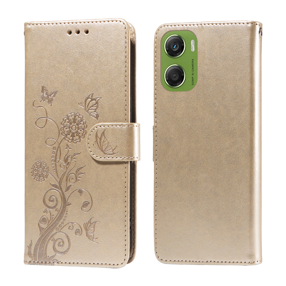 (Golden) For Motorola Moto G06 4G Leather Case Butterfly Floral Imprint Wallet Stand Cover - Golden