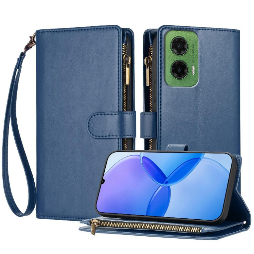 (Blue) Case for Motorola Moto G35 Pu Leather Wallet Zipper Handbag Cover Folio Flip Card Slots