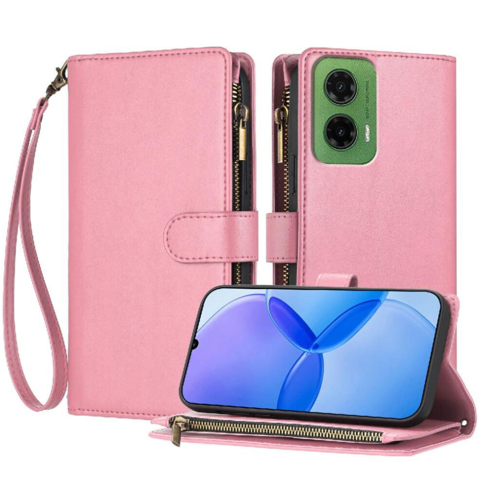 (Pink) Case for Motorola Moto G35 Pu Leather Wallet Zipper Handbag Cover Folio Flip Card Slots