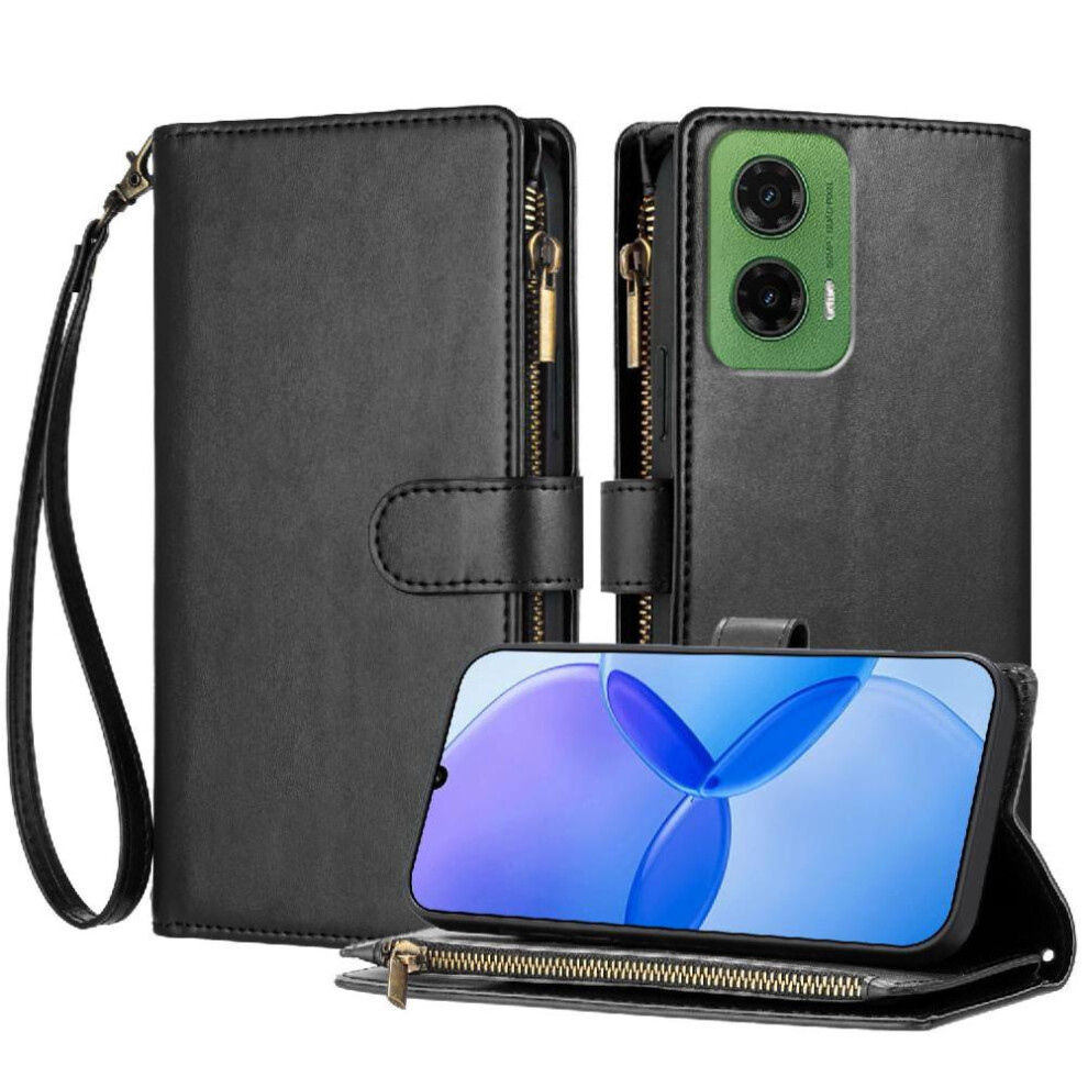 (Black) Case for Motorola Moto G35 Pu Leather Wallet Zipper Handbag Cover Folio Flip Card Slots