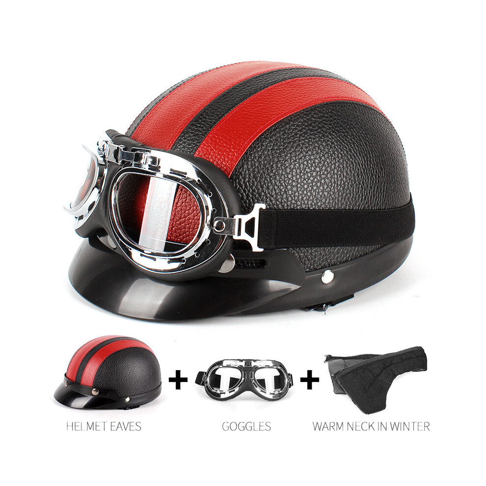 (Red) Retro Leather Motorbike Helmet Motorcycle Riding Vintage Cruiser Touring Half Helmets Moto Bicycle Scooter Skating