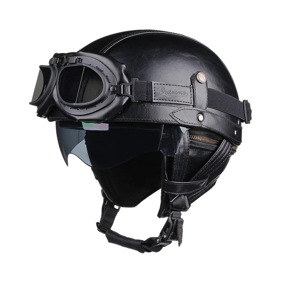 (535 Glasses BK, L) Retro Motorcycle Helmet PU Leather Moto Helmets Men Women Half Helmet HD Lens Casco Four Seasons Riding Scooter Capacetes