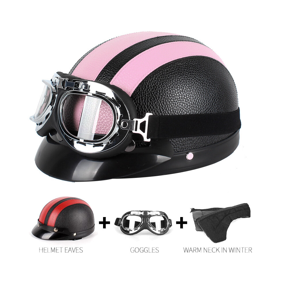 (Pink) Retro Leather Motorbike Helmet Motorcycle Riding Vintage Cruiser Touring Half Helmets Moto Bicycle Scooter Skating