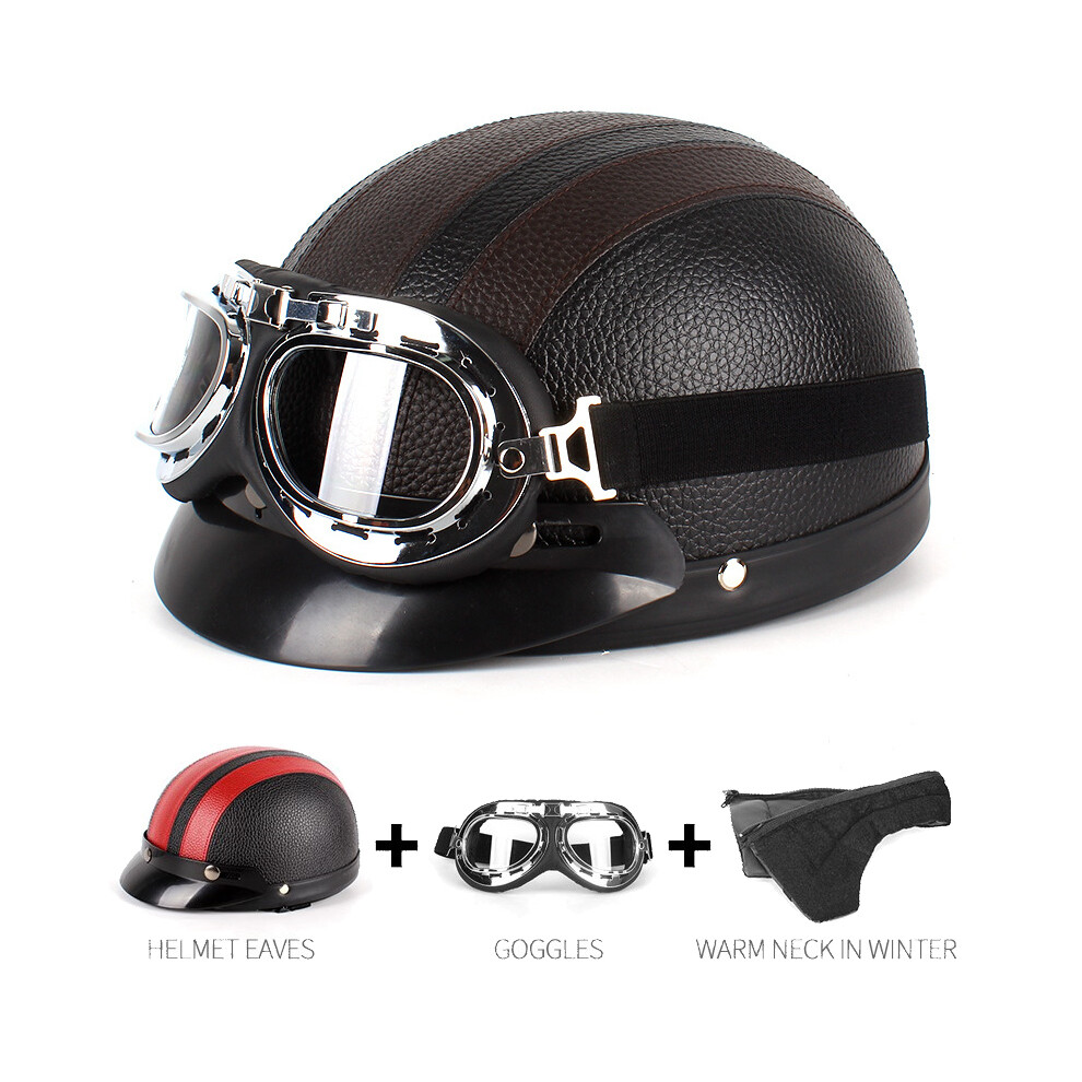 (Brown) Retro Leather Motorbike Helmet Motorcycle Riding Vintage Cruiser Touring Half Helmets Moto Bicycle Scooter Skating