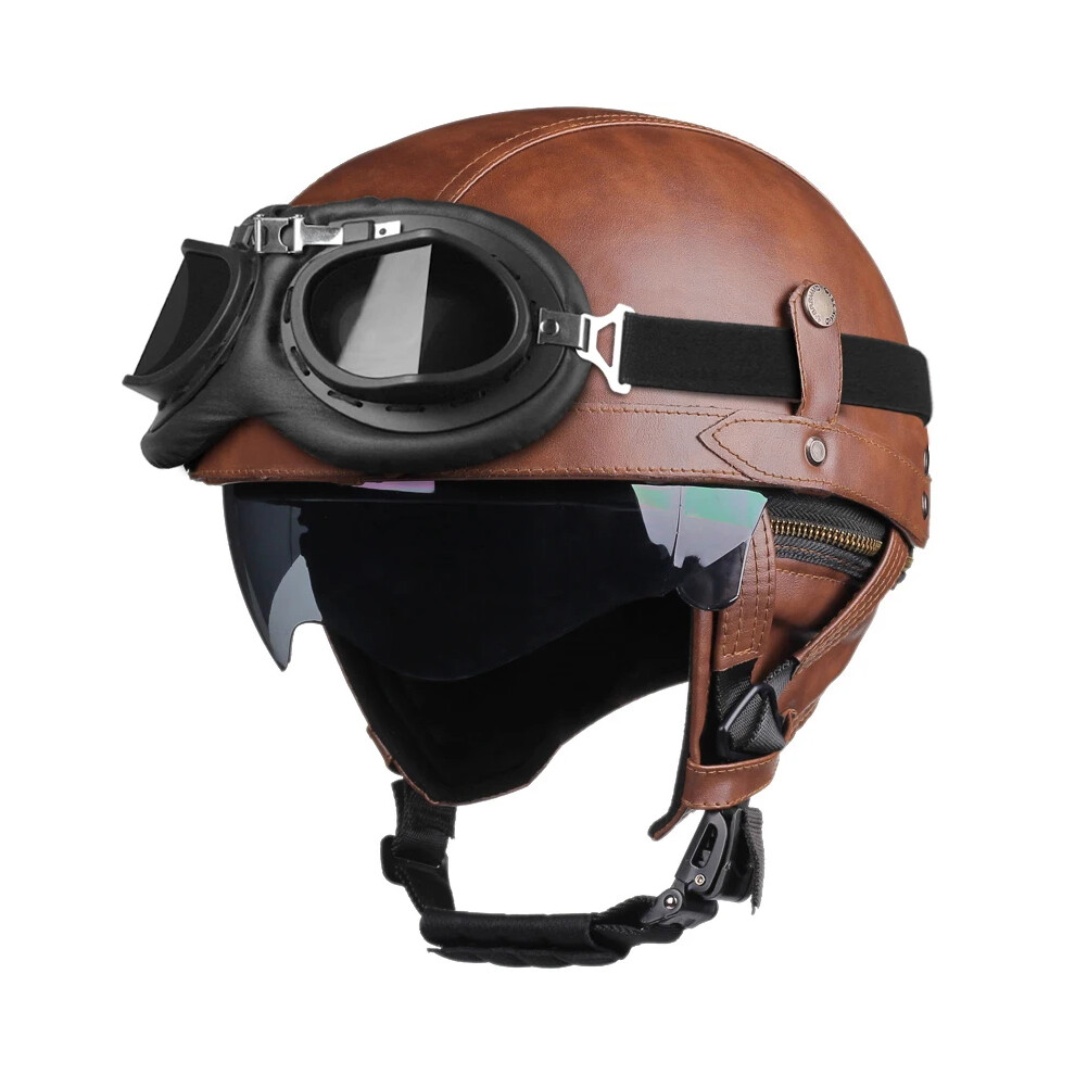 (535 Glasses BR, L) Retro Motorcycle Helmet PU Leather Moto Helmets Men Women Half Helmet HD Lens Casco Four Seasons Riding Scooter Capacetes