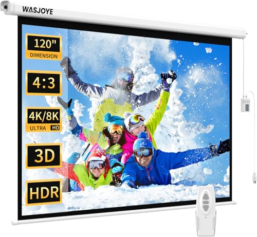 WASJOYE 120"Motorized Projector Screen Electric Diagonal Automatic Projection 4:3 8K HD Movies Screen for Home Theater Cinema Office Video Game Indoor W/Remote Control and Wall/Ceiling Mount