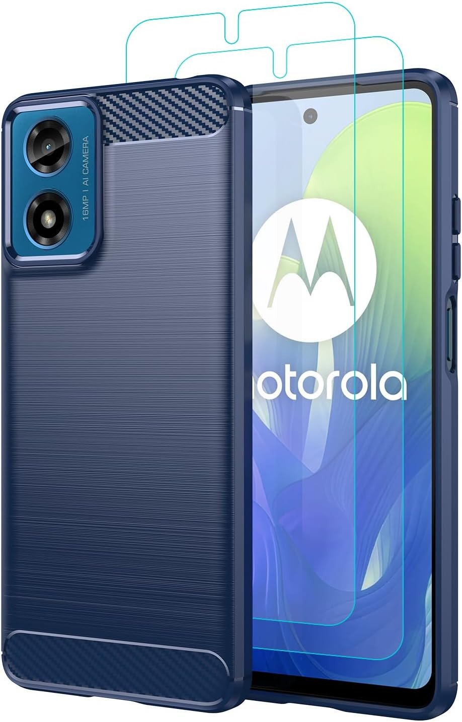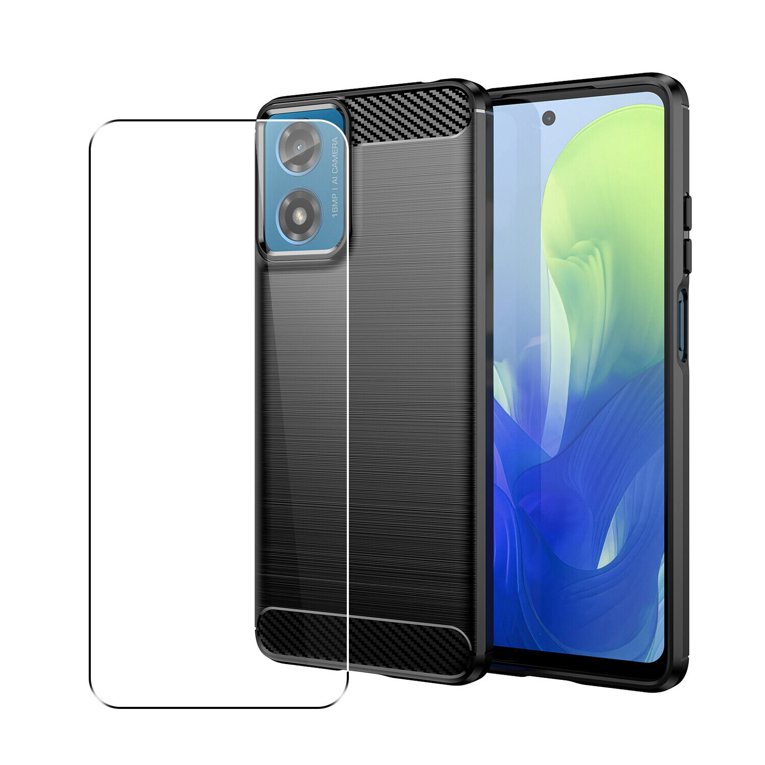 Carbon Case for Motorola Moto G04 Phone Cover and Glass Screen Protector Black