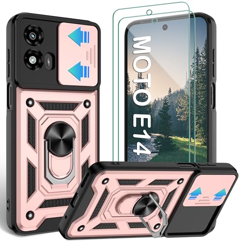Jshru for Motorola E14 Phone Case with Screen Protector | Camera Protection Cover | Military Grade Shockproof Cover Fit Moto G24 | Moto G04 | Ring Kickstand Case for Motorola Moto E14,Rose Gold