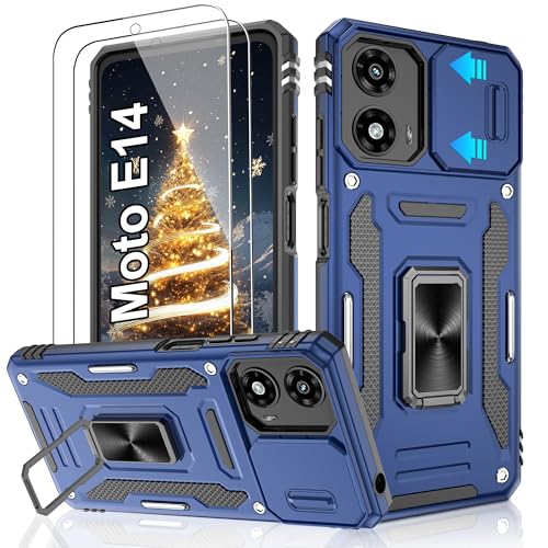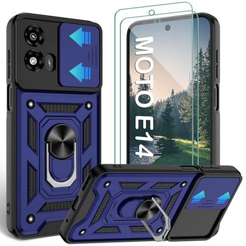 LeYi for Motorola Moto E14 / G04 / G24 / G04s Phone Case, 2 Pack Screen Protectors, Camera Lens Slider, Ring Stand Holder, Heavy Duty Protective Shockproof Mobile Cover for Moto E 14 / GO4, Blue