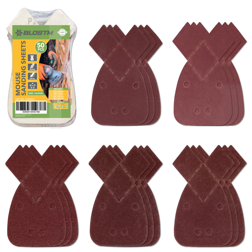 BLOSTM 50pcs Detail Palm Mouse Sander Pads 40 to 240 Grit Mouse Sanding 140mm