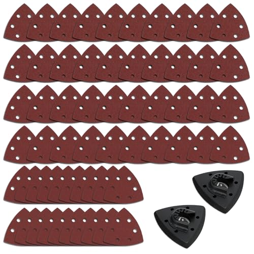 62Pcs Multi Function Triangular Sanding Pad Kit, Mouse Sander Detail Sandpaper, 60 80 120 180 240 320 Grit Hook Loop Multitool Sandpaper with 2 Multitool Schleifplatte for Grinding and Polishing