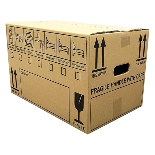 10 Strong Large Cardboard Storage Packing Moving House Boxes with Fragile Tape 52cm x 30cm x 30cm 47 Litres Carry Handles and Room List