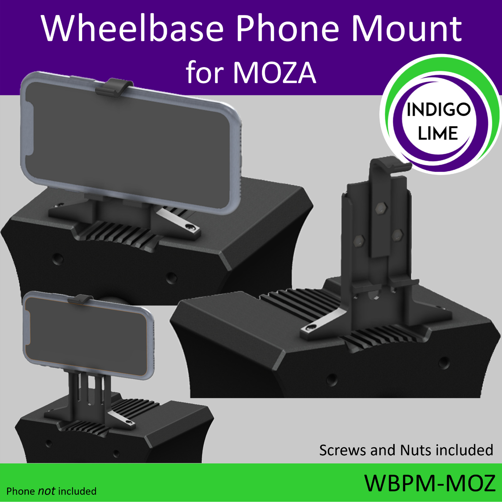 Wheelbase Phone Mount for MOZA R3 / R5 / R9 / R12. Made in the UK
