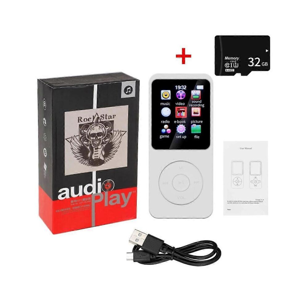 (With 32G TF Card, white) Mini MP3 MP4 Players FM Radio Bluetooth-Compatible 5.4 Stereo Music Player Portable Speaker Support FM TF Card E-Book Voice