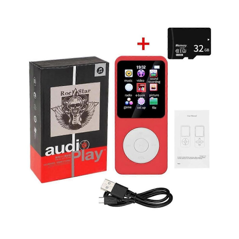 (With 32G TF Card, red) Mini MP3 MP4 Players FM Radio Bluetooth-Compatible 5.4 Stereo Music Player Portable Speaker Support FM TF Card E-Book Voice Re