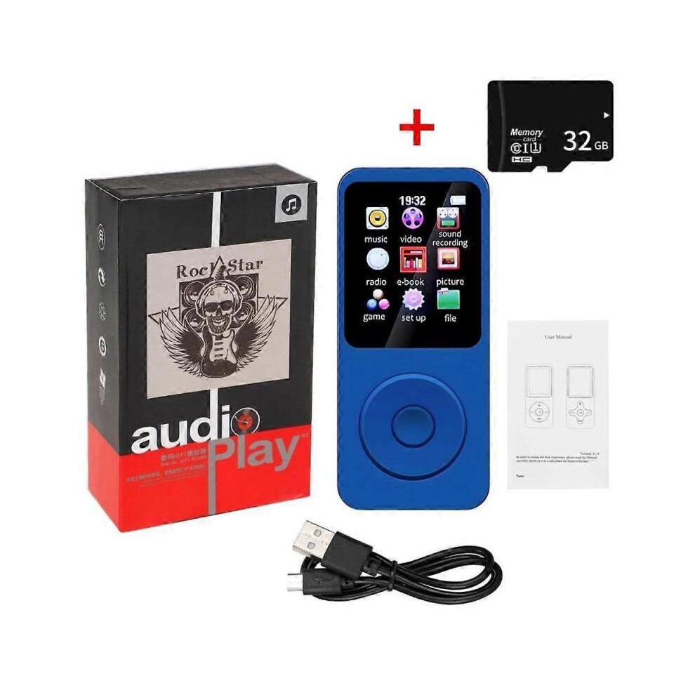 (With 32G TF Card, blue) Mini MP3 MP4 Players FM Radio Bluetooth-Compatible 5.4 Stereo Music Player Portable Speaker Support FM TF Card E-Book Voice R