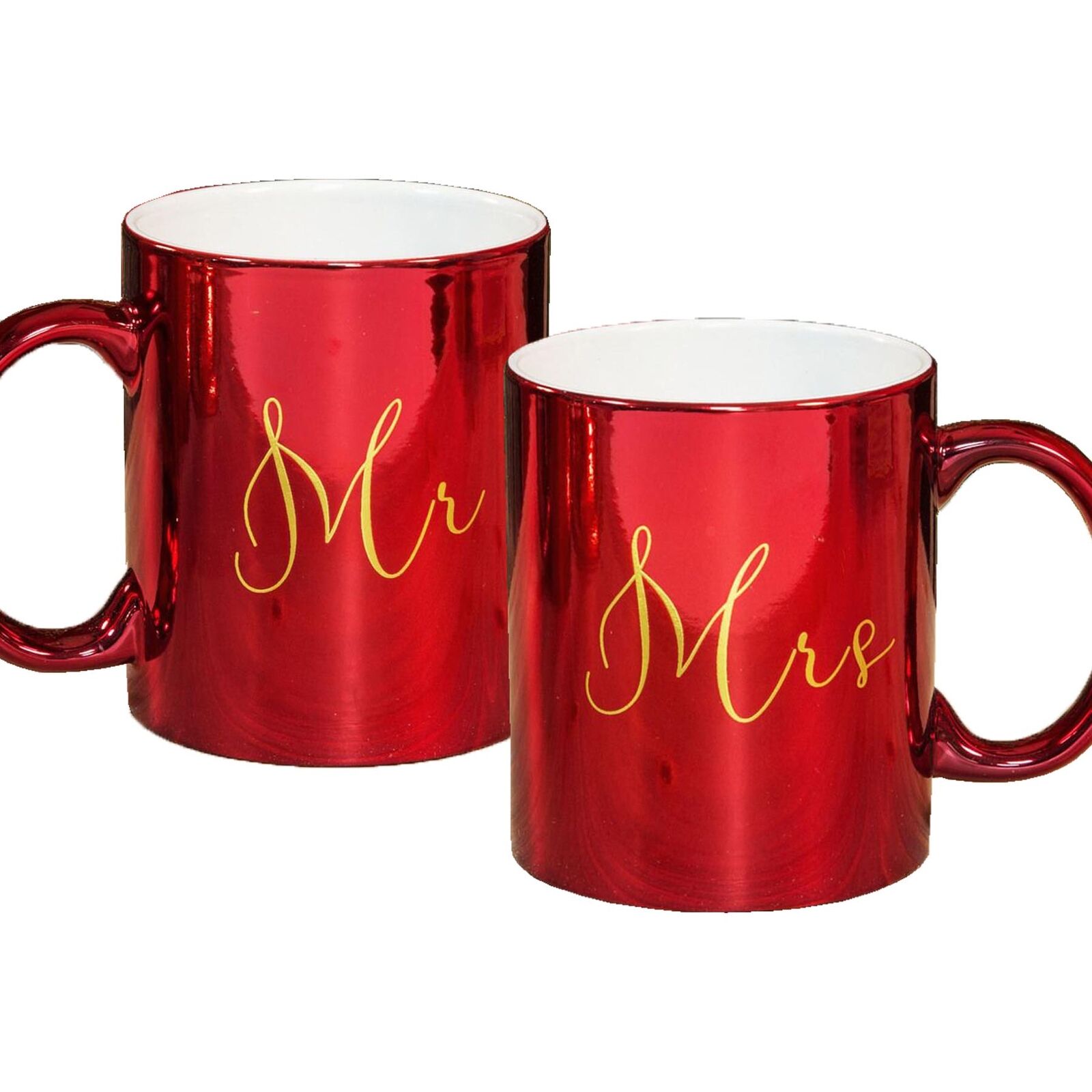 Set of 2 Christmas Mugs Red Metallic Coated with Gold 'Mr and Mrs'
