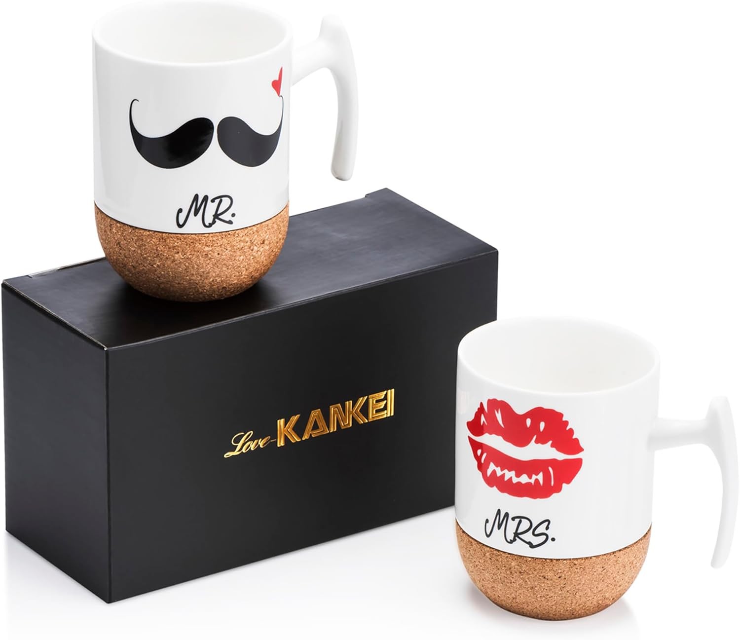 Love-KANKEI Mr and Mrs Ceramic Mugs with Novelty Cork Bottom - Wedding Gifts/Valentines Gifts for Couples - Set of 2/10.5 oz