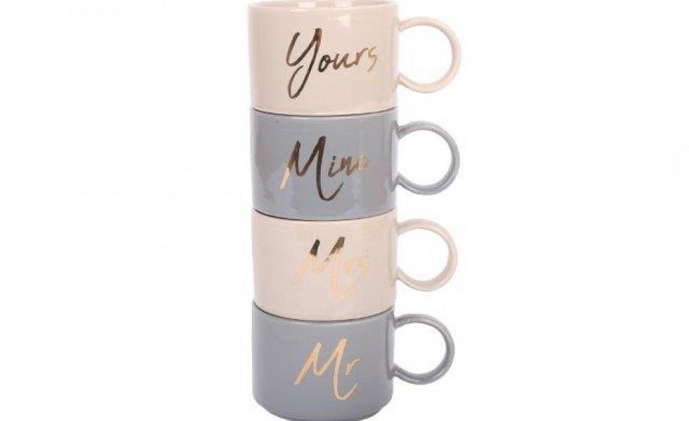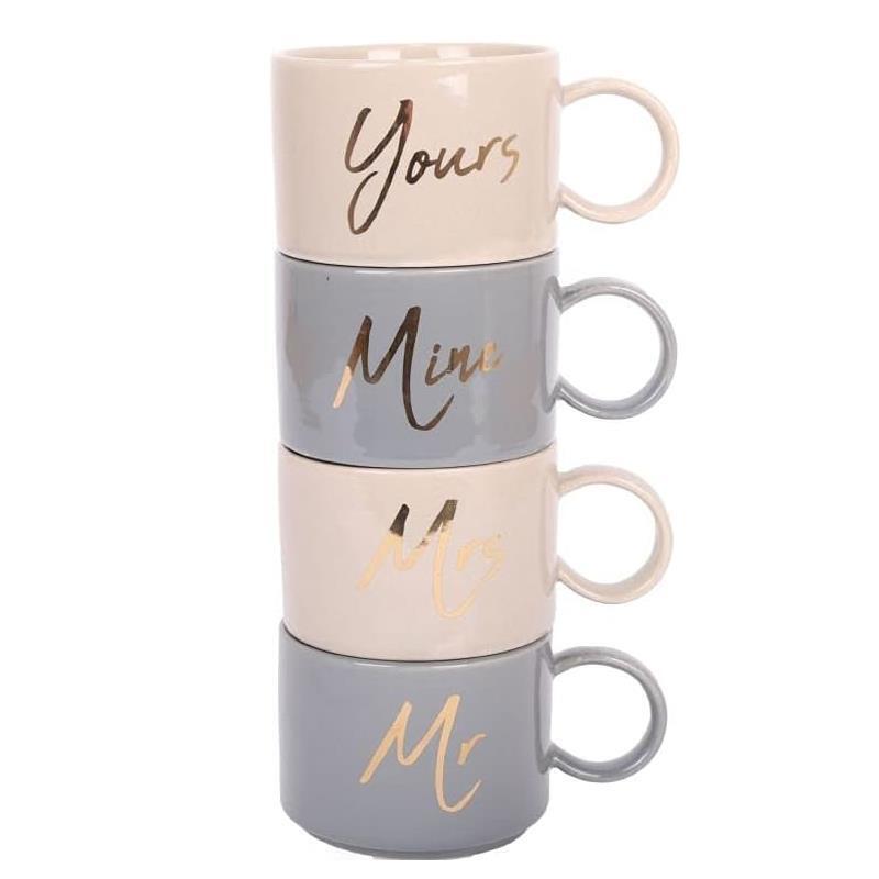 Set of 4 Mr Mrs Stacking Mugs With Gold Words