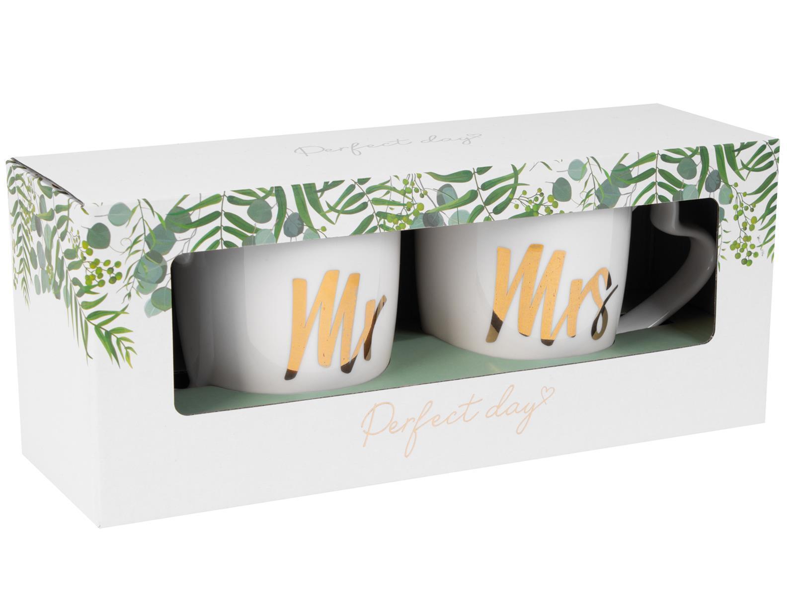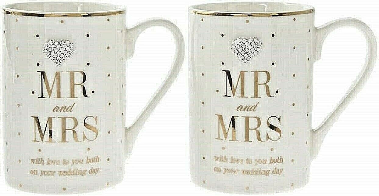 Mr & Mrs Mugs Wedding Gift Set Perfect Day White Gold Bone China Heart Handle