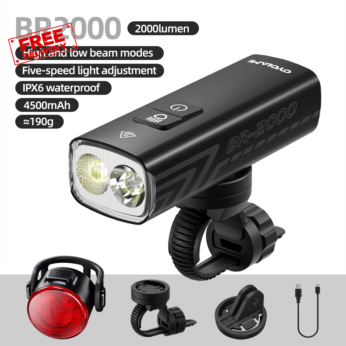 2000 Lumens Bike Headlight Bicycle Flashlight Handlebar Type-C MTB Road Highlig