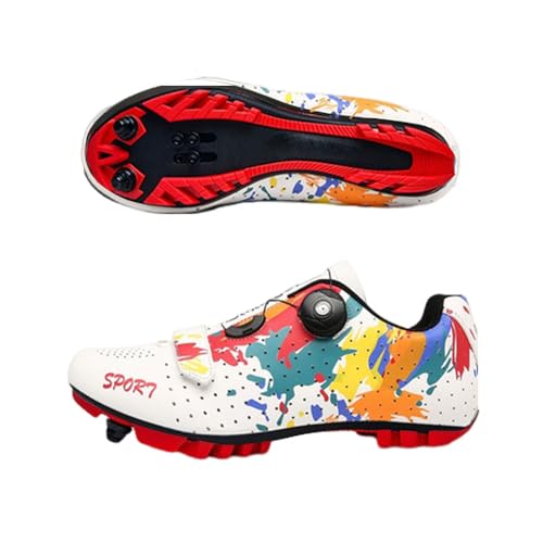 ENEN Men's Cycling Shoes, MTB Shoes with SPD Cleats Indoor Outdoor Mountain Bike Shoes, Colorful Graffiti Breathable Spin Shoes Road Rcing Bikes Shoe for Mens Womens White