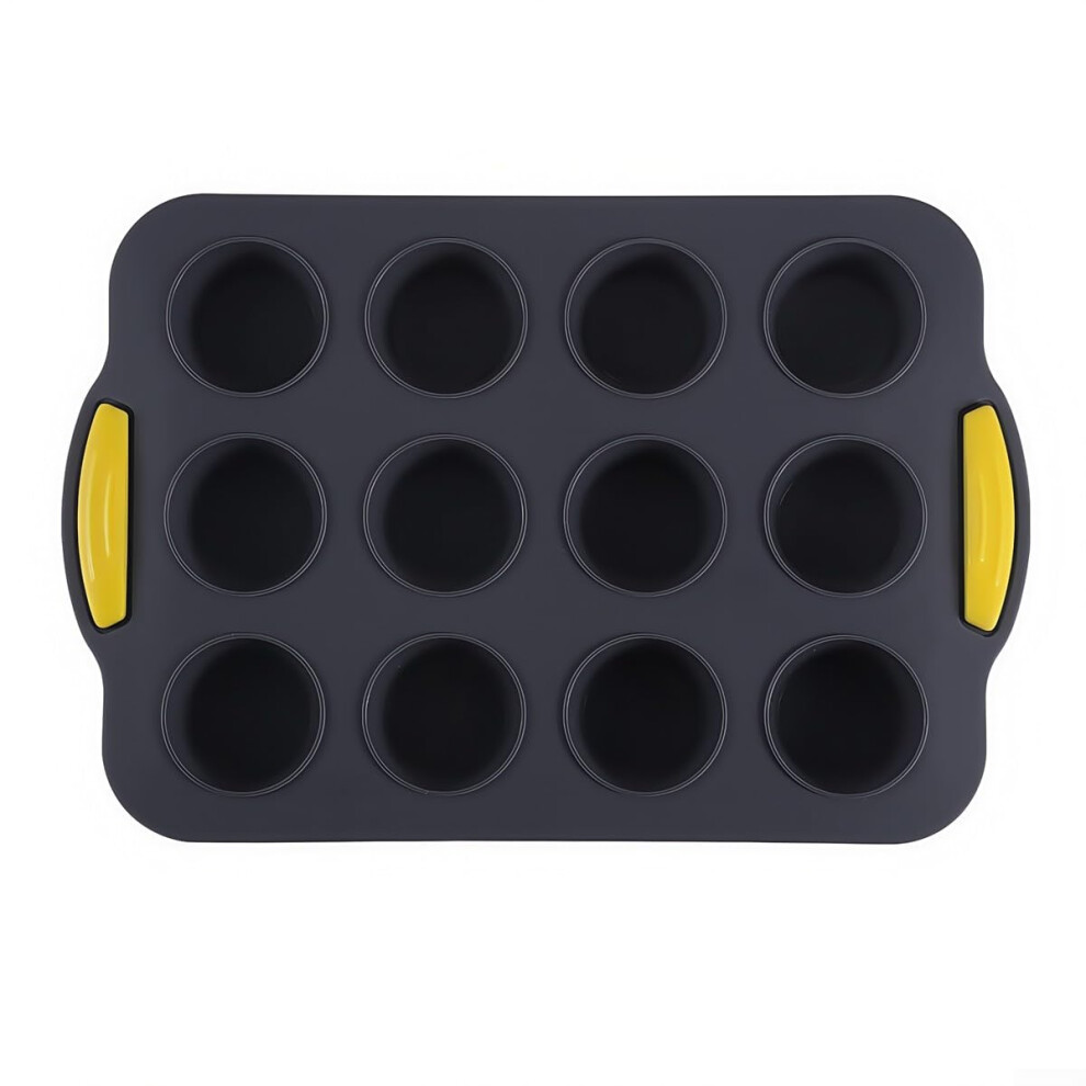 Silicone Muffin Pan Nonstick Bakeware Cupcakes Cookies Bread Deep Gray With Yellow Handles Heat Conductive Easy Clean