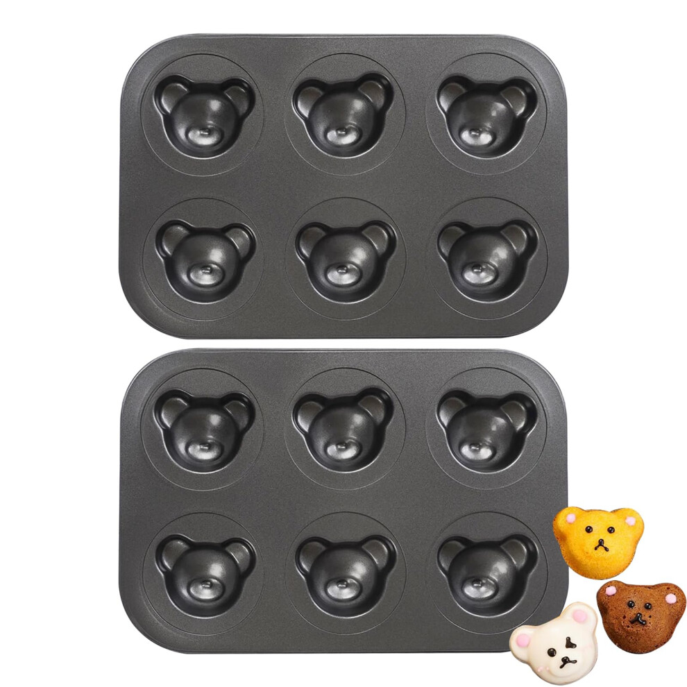 6 Cup Carbon Steel Non Stick Muffin Pan Set for Baking Cupcakes and Mini Cakes, 2pcs Bear Shape
