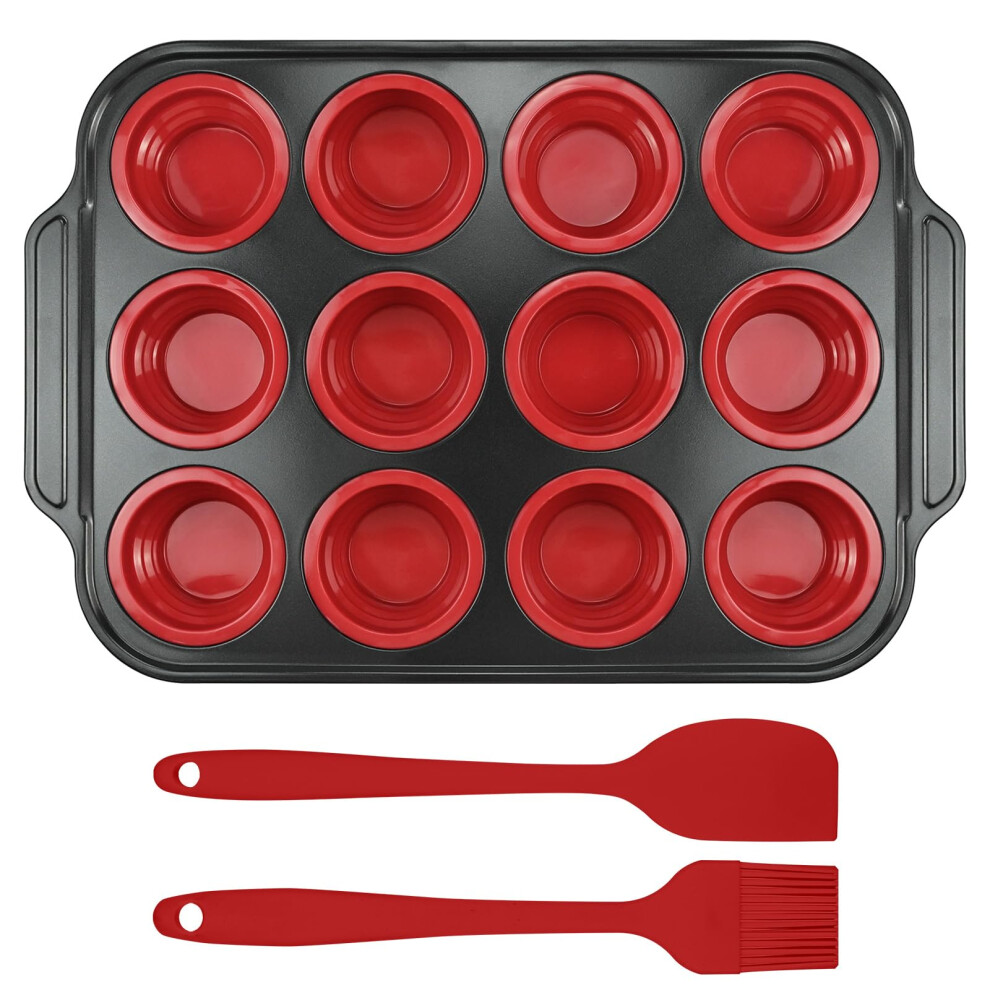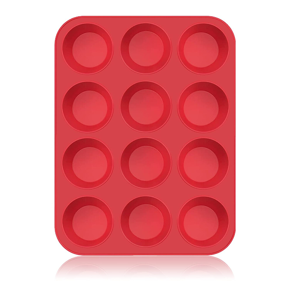 Silicone Muffin Pan 12 Cup Nonstick with Reinforced Metal Frame for Cupcakes and Egg Bites, Red