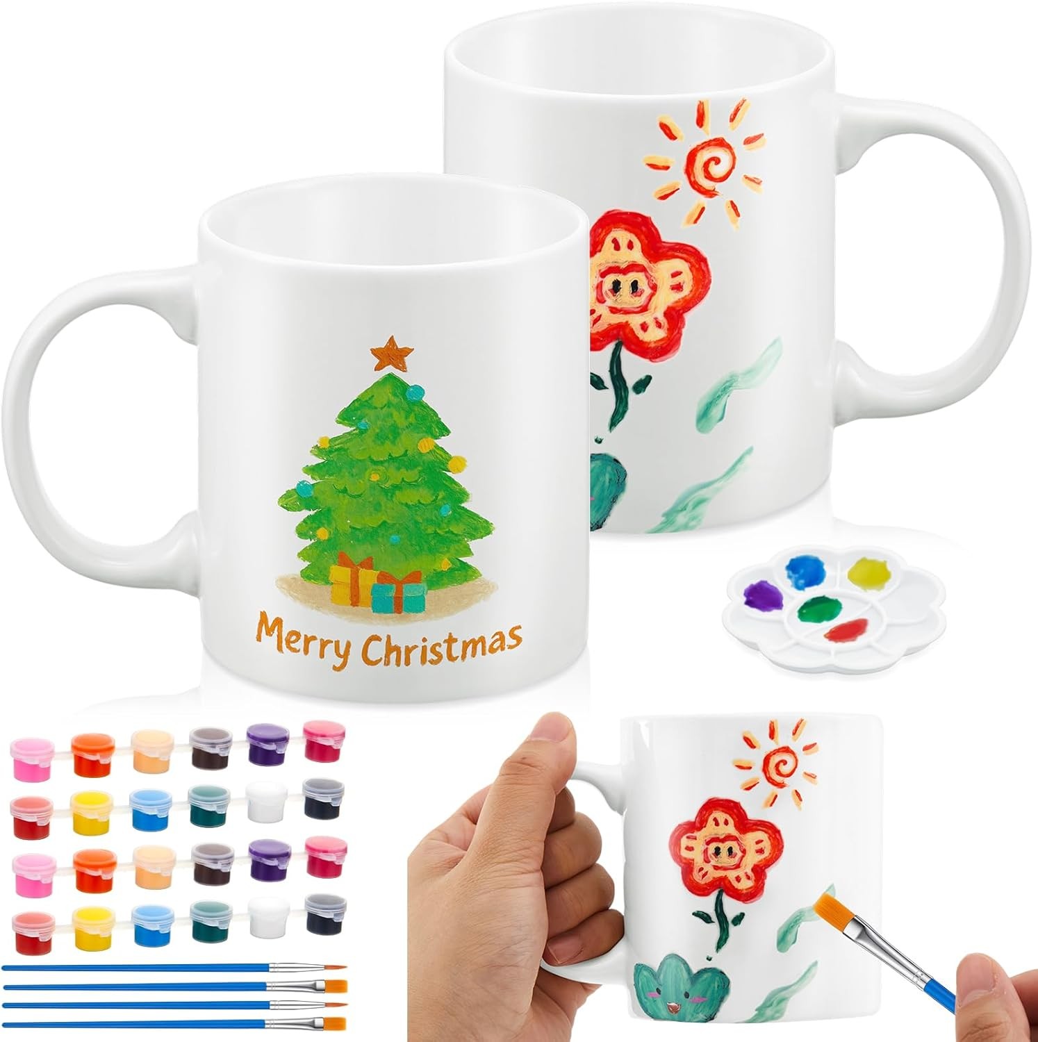 2 Set Pottery Painting Your Own Mug Kit Gifts for Christmas, 2 Blank Ceramic Su